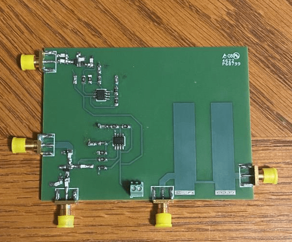 Above is the board that we designed. Unfortunately, only our filter ended up working, but it was still a great experience, and demonstrated how important it is to design carefully when working with high frequencies. We believe that part of the reason that the amplifier failed is that, while designing it in ADS (high frequency circuit design software) it did not need a stability network, but in it’s physical implementation, unaccounted for variables may have destabilized the transistor in a way we did not expect.