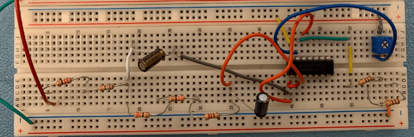 As I was just learning circuit design, everything in this project was done using a breadboard and through hole components. My final design can be seen below, with more details included in the lab report.